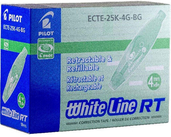 Pilot White Line RT Hibajavító Roller - 10 db/csomag - Környezetbarát megoldás a hibák javítására! ♻️ A Pilot White Line RT hibajavító roller egy modern és praktikus eszköz a hibák gyors és hatékony javítására. A nyomógombos kialakítás kényelmes használatot biztosít, a cserélhető betét pedig gazdaságos megoldást nyújt. Főbb jellemzők:Kiszerelés: 10 db/csomag Szalag hossza: 6 m Szalag szélessége: 4 mm Nyomógombos működés Cserélhető betétes kialakítás Környezetbarát választás: A White Line RT a Begreen termékcsalád tagja, mely újrahasznosított műanyagból készül. A Pilot elkötelezett a környezeti lábnyom csökkentése iránt. A hibajavító és betét újrahasznosított műanyag felhasználásával készült. Háromszori újratöltéssel ellensúlyozható a szén-dioxid-kibocsátás. A gyártástól a termék élettartamának végéig, az újrahasznosított anyagból készült Begreen hibajavító megvásárlásával és annak háromszoros újratöltésével 72%-kal csökkenthető a termék környezeti hatása 3 új hibajavító vásárlásához képest. Ez az apró gesztus jelentős változást hozhat a klímaváltozás elleni küzdelemben! ?